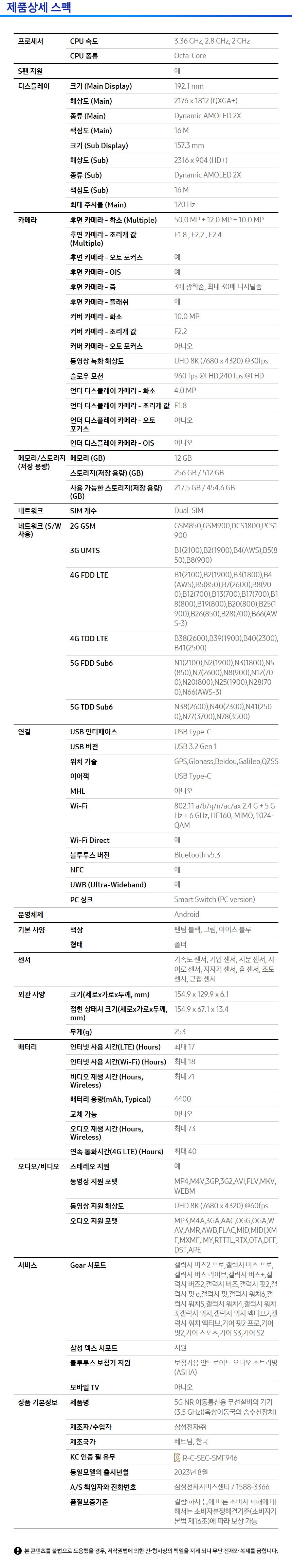 [256GB -> 512GB 업그레이드] 삼성전자 갤럭시 Z 폴드5 5G 자급제 SM-F946N