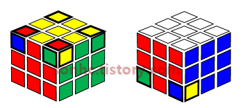 7-1) 3층 모서리 큐브만 맞지 않은 상태에서 (6단계 완료) 큐브 전체 위/아래 뒤집기 → 흰색을 윗면으로, 노란색을 아래면으로 |