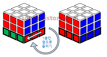 7-3) 1층 맞춰진 코너를 1층만 오른쪽으로 돌려서 맞춰야 할 다른 코너 큐브 찾기 → 방향 유지하고 1층만 돌리기 주의! 큐브 전체를 돌리면 안됨. 잡고 있는 오른손이나 큐브 방향 바뀌면 안됨. |