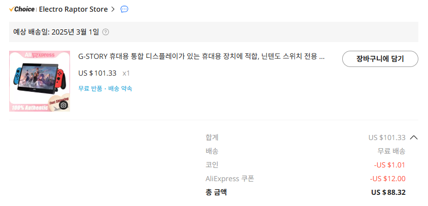 2월 할인으로 $101.33 - $1 코인 - $12 쿠폰 = $88.32 하나 더 지름