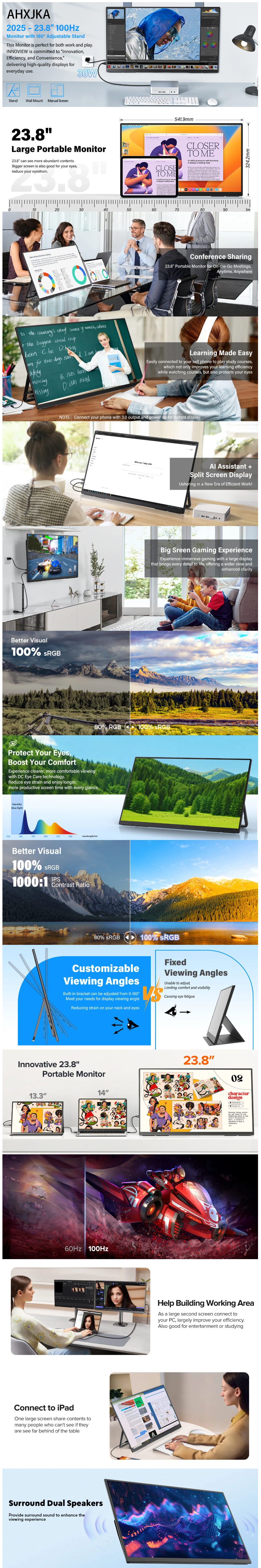 AHXJKA 23.8인치 100Hz 휴대용 모니터(178 포함) ° 조정 가능한 스탠드 유형-C HDMI IPS 아이 케어 노트