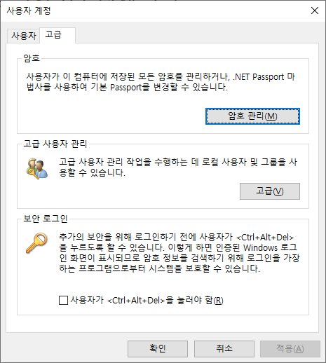 3. 사용자 계정 -> 고급 탭 -> 암호 관리