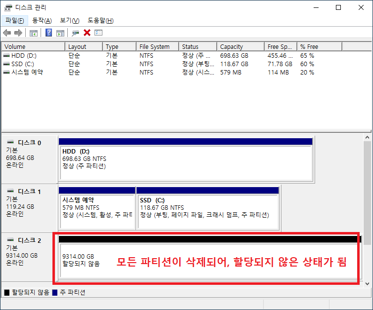 5. 모든 파티션이 삭제되면, "할당되지 않음" 상태가 됨