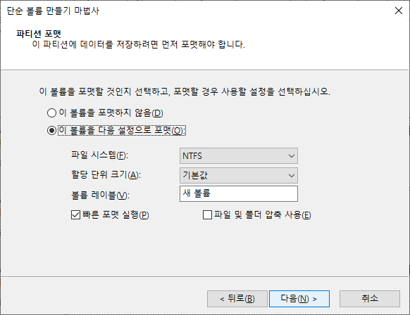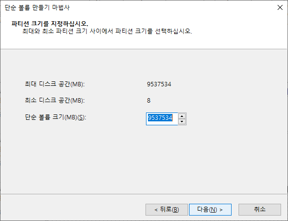 7. 단순 볼륨 만들기 마법사 시작 → 파티션 크기 지정 → 드라이브 문자 할당 → 파티션 포멧 → 마침