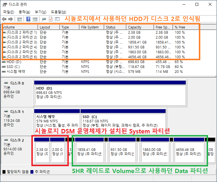 캡쳐화면은 디스크 2로 인식 되었고, 앞부분 2.38, 2.00GB 파티션은 DSM 운영체제가 설치된 System 파티션이고