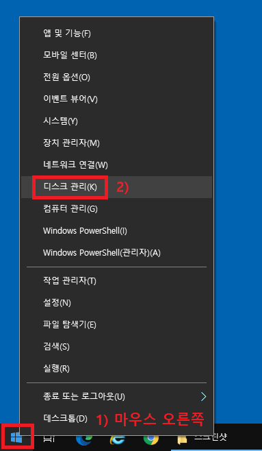 2. 왼쪽 하단 윈도우 아이콘 → 마우스 오른쪽 → 디스크 관리 실행