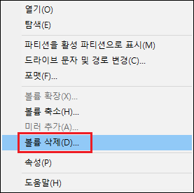 4. 분할된 파티션 선택 → 마우스 오른쪽 → 볼륨 삭제 → 모든 파티션이 삭제 될 때까지 반복