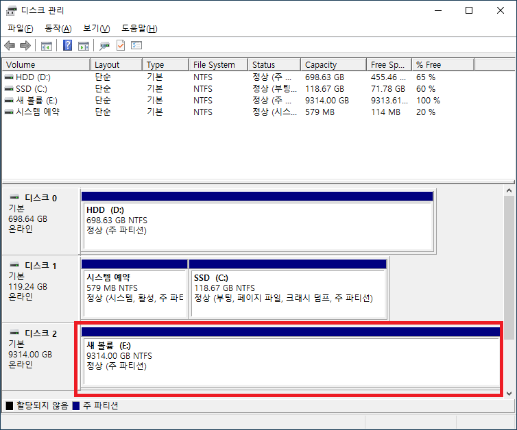 6. 디스크 2의 "할당되지 않음" 선택 → 마우스 오른쪽 → 새 단순 볼륨