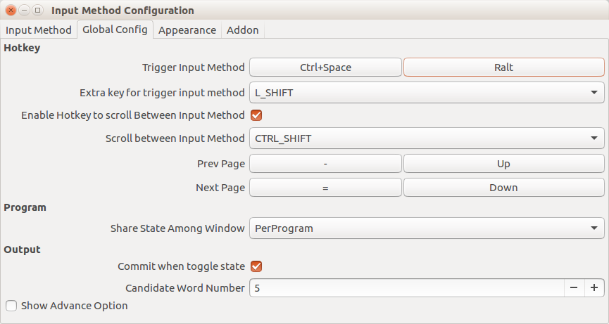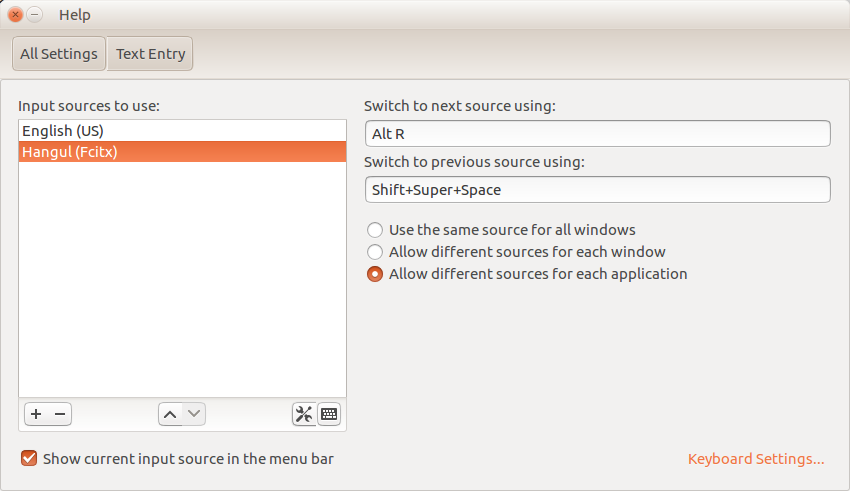- Setting -> Text Entry -> Hangul (Fxitx) -> Input Method Configuration -> Global Config 탭 -> Trigger Input Method -> 2번째 -> 한/영키 지정