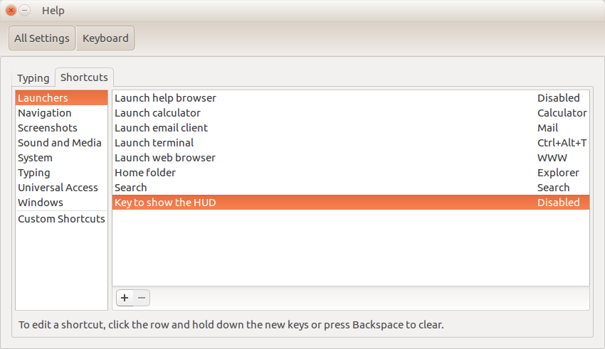 - Setting -> Keyboard -> Shortcuts 탭 -> Launchers -> Key to show the HUD -> 선택 -> 백스페이스 -> Disabled 변경