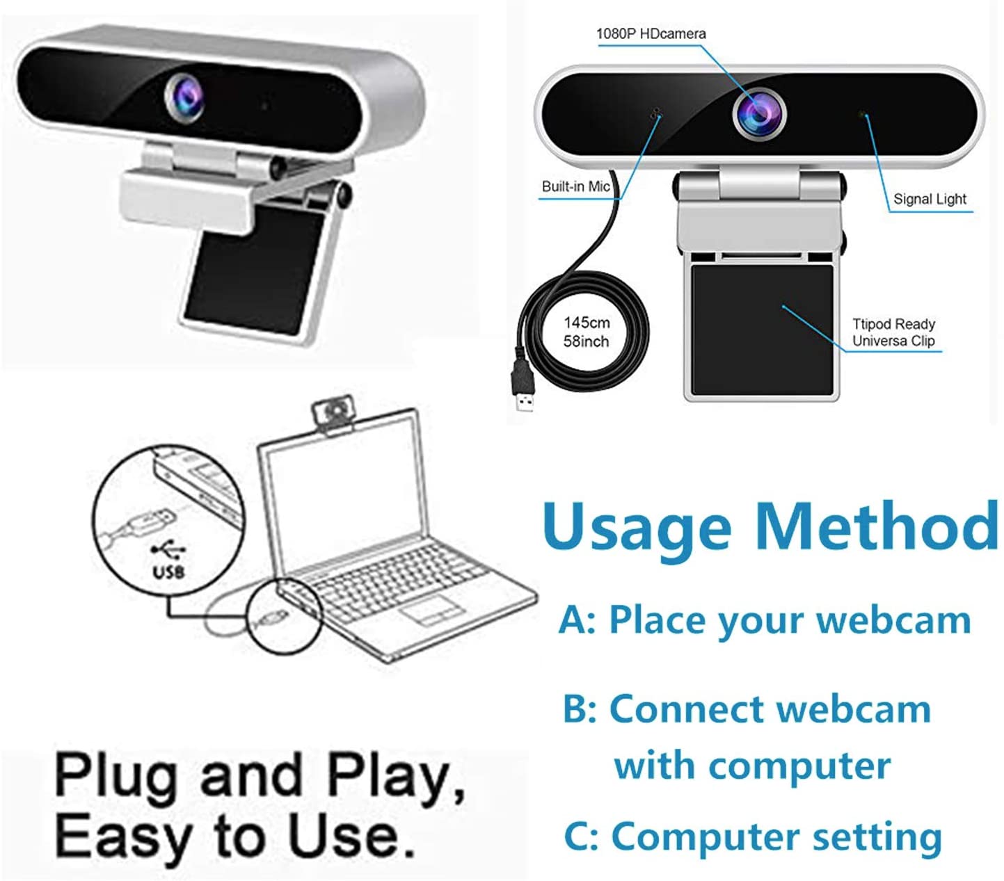 Webcam with Microphone 1080p HD USB Camera 30fps Streaming Webcam with Tripod and Privacy Cover,Plug and Play for Desktop/Laptop/Mac,Video Conferencing/Calling/Gaming and Skype/YouTube/Zoom etc.