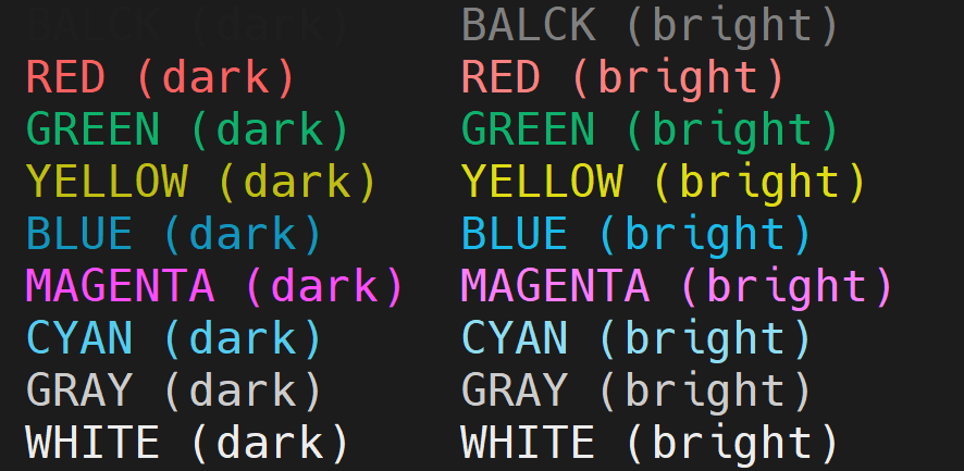 echo -e "$COLOR_BLACK_1 BALCK (dark) $COLOR_BLACK_2 BALCK (bright) $COLOR_END"