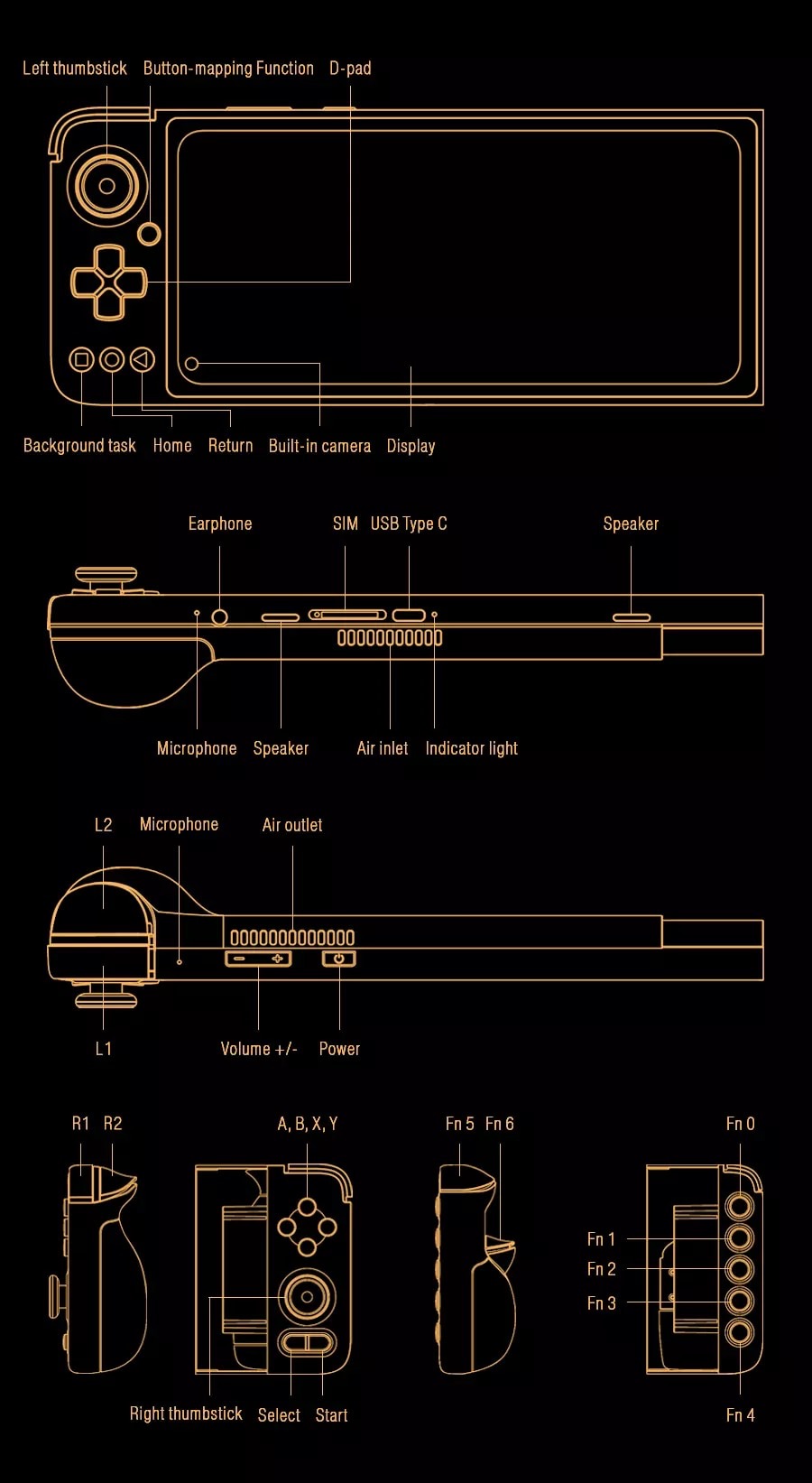 | Half button mapping gamepad mode | ALPS original 3D joystick, native support for L3 when pressed down; shoulder keys L1/L2; imitating PSV + key, key mapping call out key | |