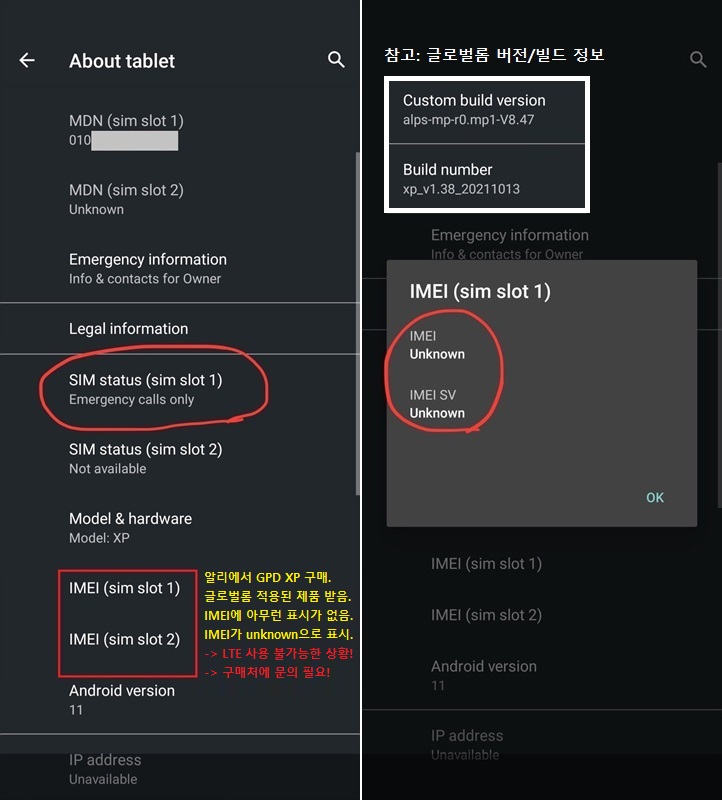 설정 -> 태블릿 정보에 IMEI 정보가 없고, IMEI를 터치하면 unknown 으로 표시되는 상황입니다. ;;;