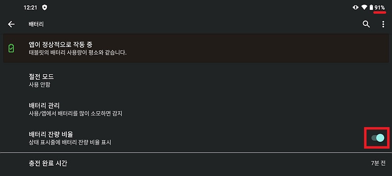 - 설정 -> 배터리 -> "배터리 잔량 비율" 설정