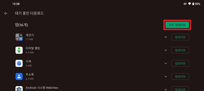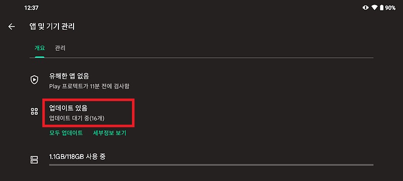 - 개요 탭 -> "앱 및 기기 관리" 선택 -> "업데이트 있음" 선택 -> "모두 업데이트" 선택