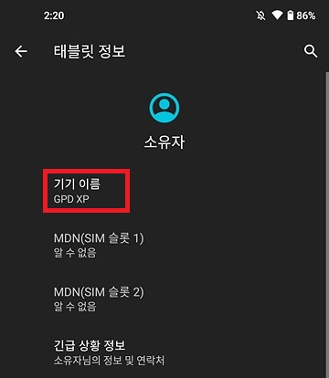 - 설정 -> 태블릿 정보 -> 기기 이름 -> "GPD XP" 설정 -> "확인"