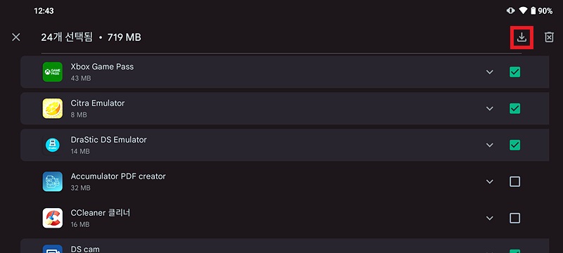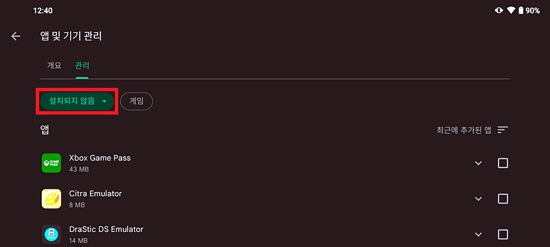 - 관리 탭 -> "설치되지 않음" 변경 -> 필요한 앱 체크 -> "설치" 버튼
