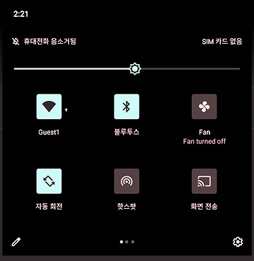 - 페이지 1 : Wi-Fi, 블루투스, Fan, 자동 회전, 핫스팟, 화면 전송