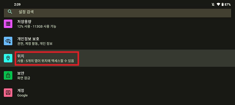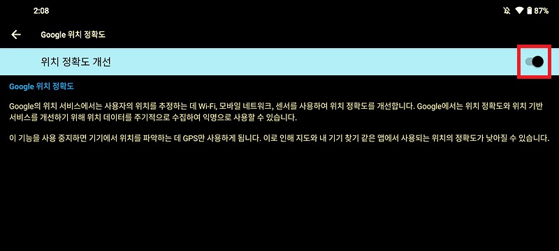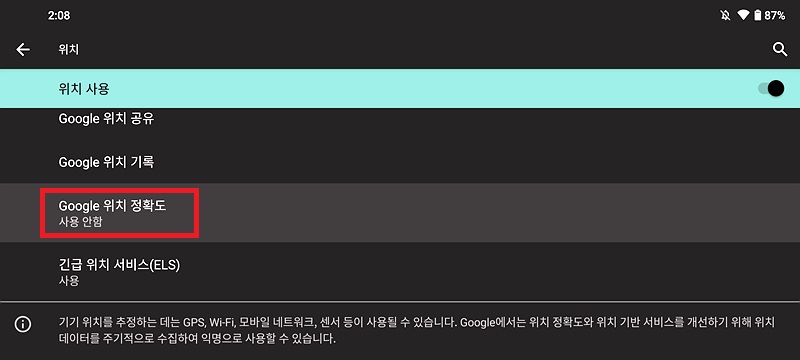 - "고급" 선택 -> "Google 위치 정확도" 선택 -> "위치 정확도 개선" 켜기 (OFF -> ON)