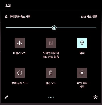 - 페이지 2 : 비행기 모드, 모바일 데이터, 위치, 방해 금지 모드, 절전 모드, 화면 녹화