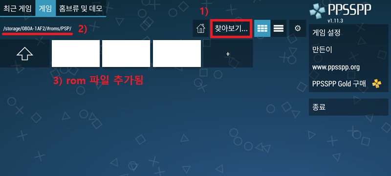 - 홈 -> 게임 탭 -> 찾아보기 -> rom 파일 경로 선택 -> rom 파일 추가됨
