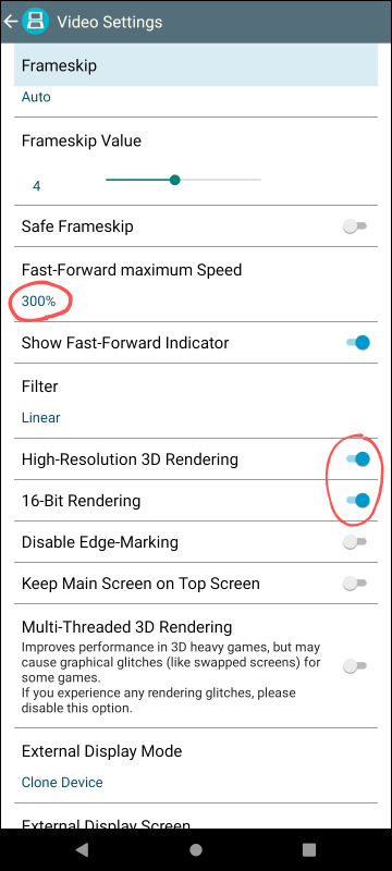 - MENU -> Options -> Video -> Fast-Forward maximum Speed -> 300% 변경, High-Resolution 3D Rendering 선택
