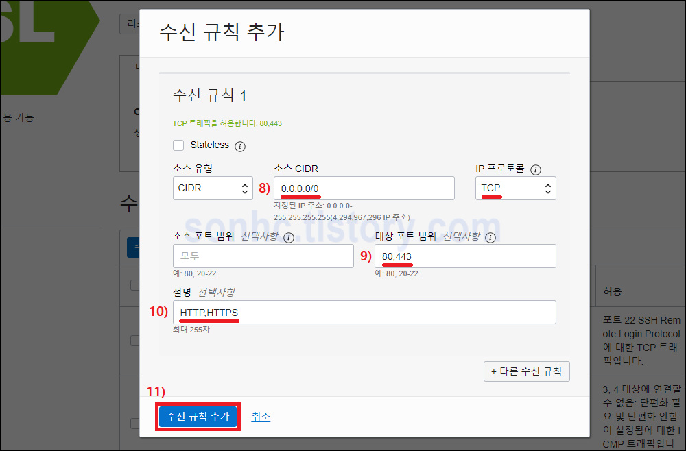 -> 8), 9), 10) 정보 입력 -> 11) [수신 규칙 추가] - END