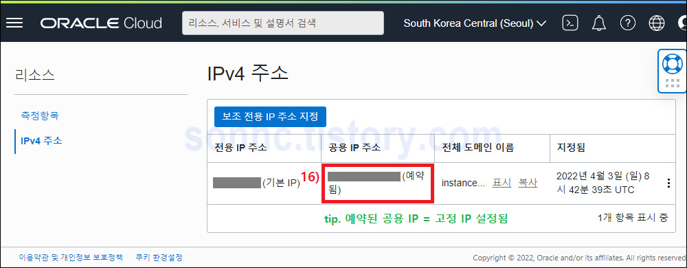 -> 5), 6), 7) 정보 입력 -> 8) [예약된 공용 IP 주소]