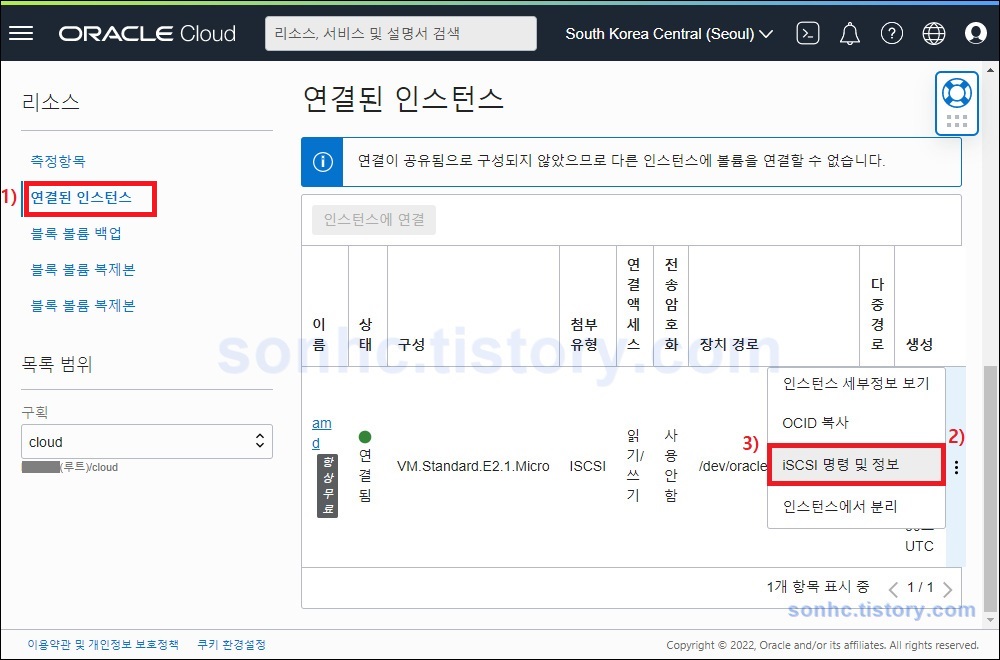 -> 리소스 -> 1) [연결된 인스턴스] -> 2) 인스턴스 오른쪽 [...] 옵션 -> 3) [iSCSI 명령 및 정보]