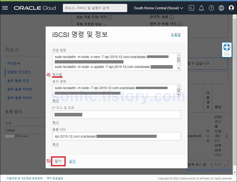 -> 연결 명령 -> 4) "복사" -> iscsiadm 명령어 3줄 메모해 놓기 -> 5) [닫기] -> END