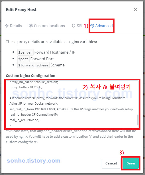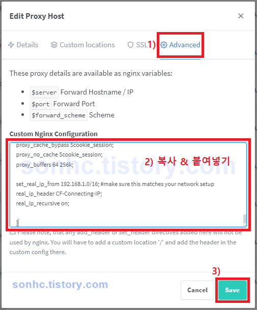 -> 수정한 내용을 2) "Custom Nginx Configuration" 박스에 붙여넣기 (CTRL + V) -> 3) Save -> END