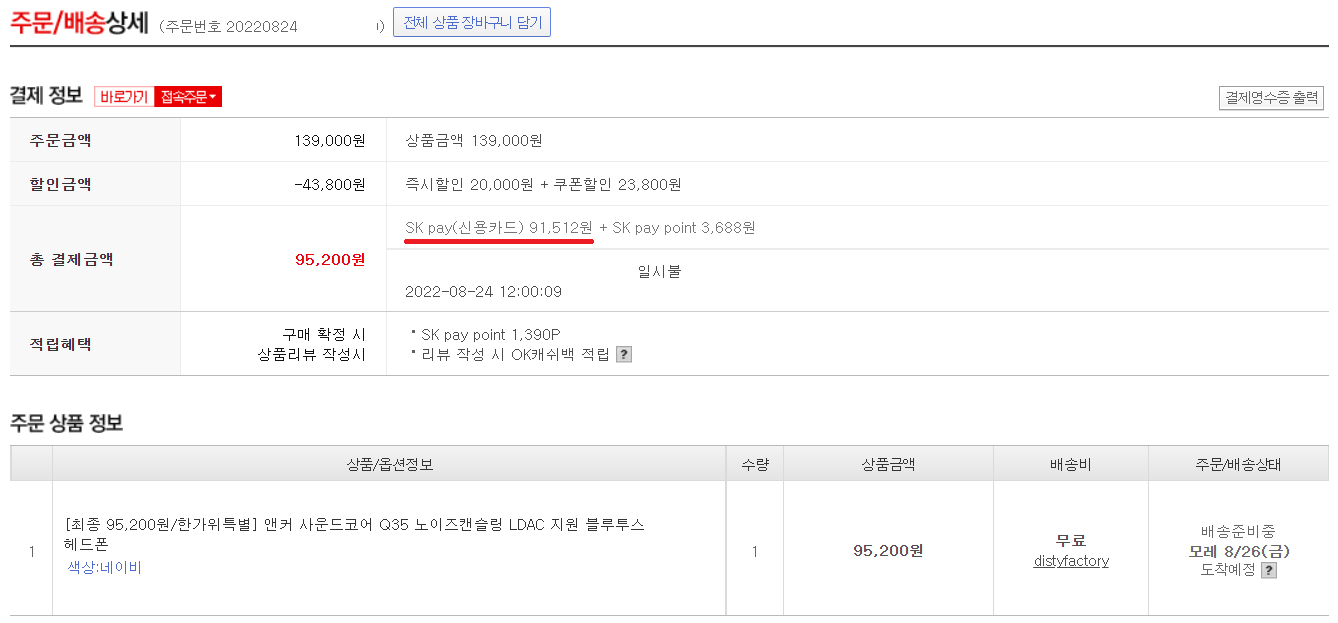 원가 119,000 - 한가위 음향기기 할인쿠폰 23,800 - skpay 포인트 3,688 = 91,512원 결제