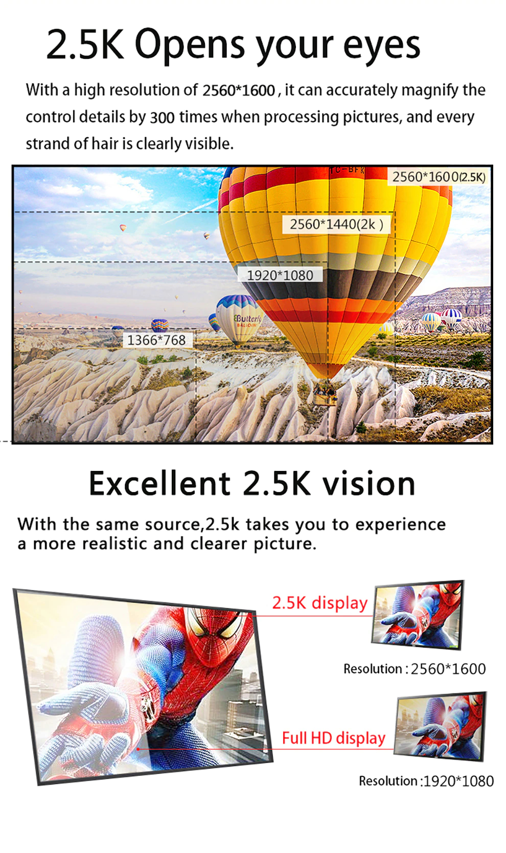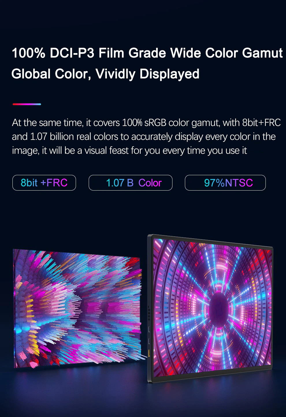 【2.5K UHD Portable Monitor】the monitor with 2.5K resolution which is equivalent to 2.5 times the resolution of 1080P, 100%sRGB and HDR technology, brings the ultimate visual experience, displays richer pictures and more complete colors.